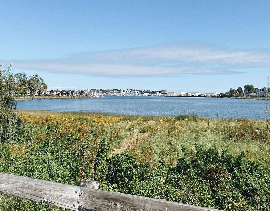 One day last week, before the cool weather brushed across the little peninsula of my city, I worked at a food truck in a local grocer's parking lot. From the backside of the building--where the big trucks port and the garbage cans are stored--you could see this view. I took a picture before hopping into a retro-fitted trailer, made swelteringly hot by a grilled cheese press. I found a placard later that indicated that the grocer worked to protect this space you see from development. A grocery store, which covered five acres of this marshy wetland in concrete, now boasts their preservation of the remaining 20 feet of shoreline.