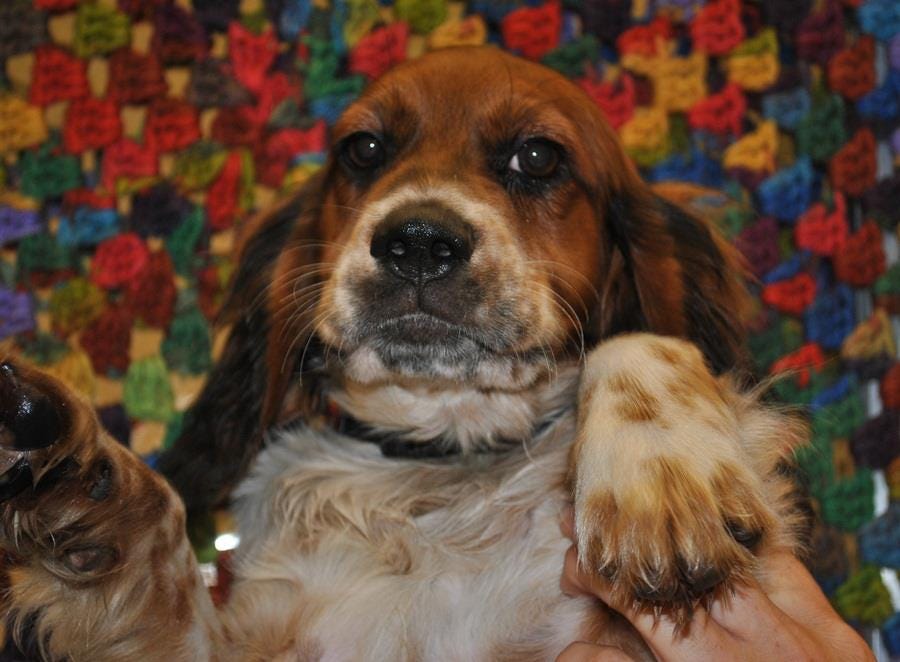 I’m not sure what it was, maybe the fact that I was quite lonely — me with all of my siblings well into adulthood and being homeschooled at this point — but though she was overwhelmed with the responsibility of being a single mom back into the workforce for the first time in 20 years, we adopted a dour looking mutt of beagle and spaniel heritage.